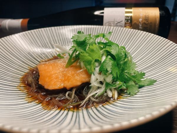 今月コースの一品ですが、年間通してちょくちょく登場するメニュー、お魚は日によって変わりますがこの日は銀鮭🐟 お魚とソースの旨みを吸った春雨、こちらも主役級の美味しさです✨